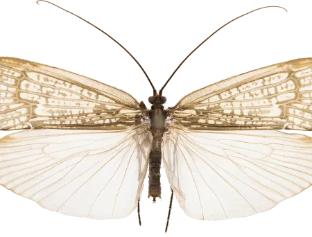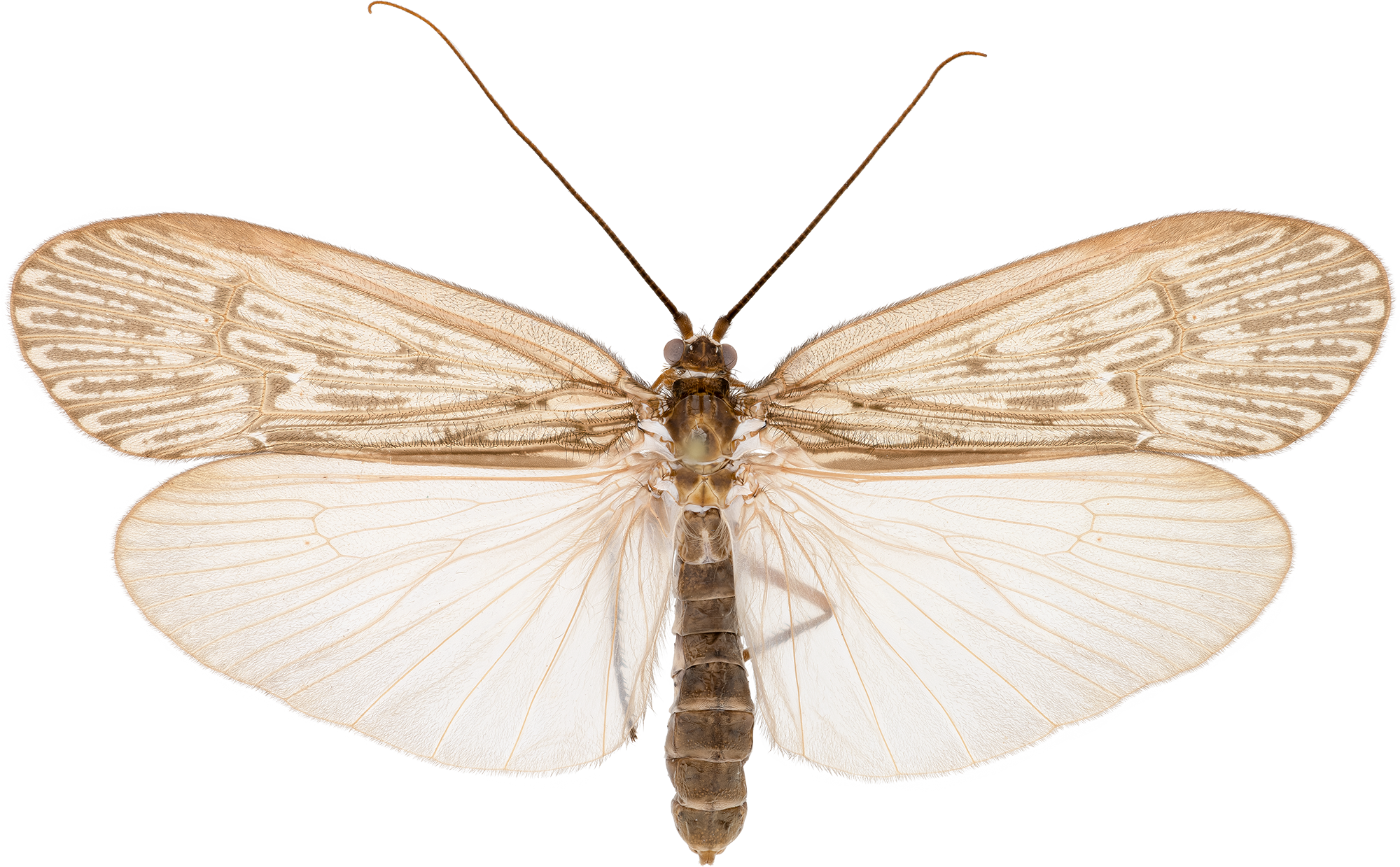 Halesus radiatus er en middels stor til stor vårflue med svært brede, gulbrune framvinger med mørkere brune tegninger. Arten er utbredt over det meste av landet. Larven lever på sand eller grusbunn i bekker og sjøer, ofte blant døde grener av løvtrær. Den bygger et rett, portabelt hus av bark eller trefliser, ofte med én eller to lengre pinner festet langs siden av huset.