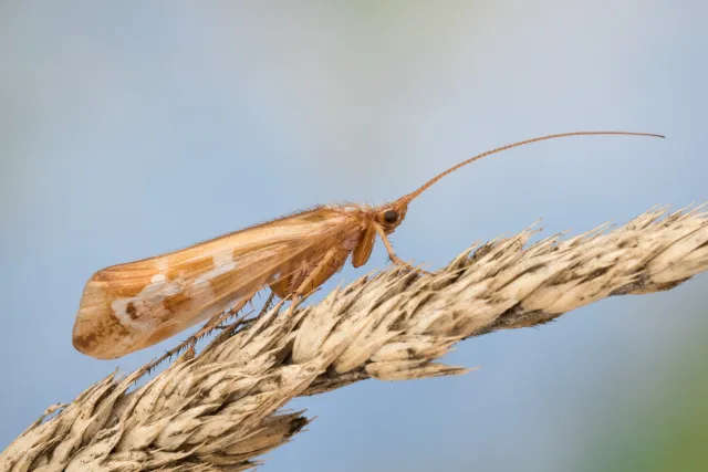 Arten lever i sjøer, dammer, elver og bekker med frodig vegetasjon, særlig i flommark langs sjøer og elver. Larven lever blant vegetasjonen langs bredden. Den bygger et portabelt hus av lange, overlappende plantebiter.