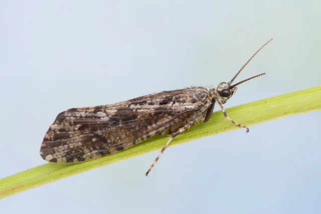 Agrypnia varia er en middels stor vårflue med moderat brede, mørkegrå og kraftig brokete framvinger. Arten er vanlig i kystnære strøk i Sør-Norge og er funnet nord til Nordland. Larven lever i dammer og sjøer. Den bygger et rett, portabelt hus av biter av plantemateriale arrangert i spiralform.
