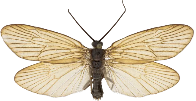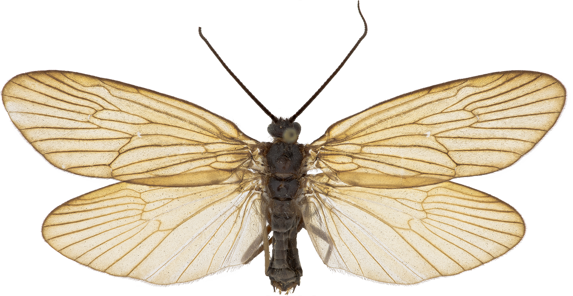 Oligotricha striata er en middels stor vårflue med ensfarget mørkebrune framvinger og oransje halskrage. Arten er utbredt over det meste av landet, men er bare funnet et fåtall ganger. Larven lever i stillestående vann som pytter, dammer og grøfter. Den bygger et portabelt hus av biter av plantemateriale arrangert i spiralform.