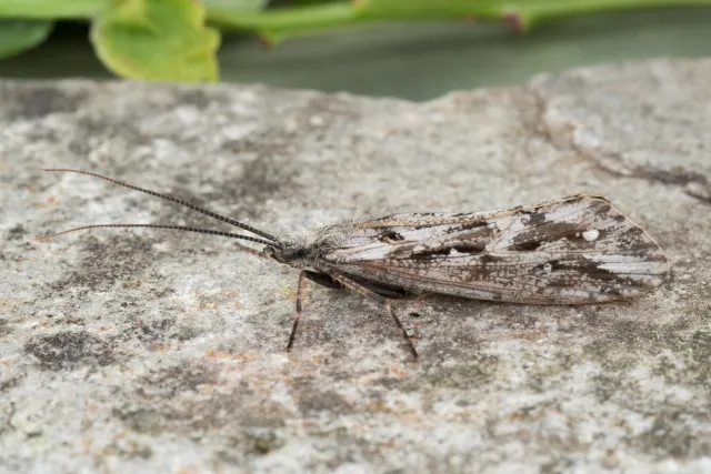 Phryganea bipunctata er en meget stor vårflue med brede, grålige framvinger. Arten er utbredt over hele landet. Larven lever i sjøer, dammer og i rolige partier i elver. Den bygger et opptil 60 mm langt, portabelt hus av biter av plantemateriale arrangert i spiralform.