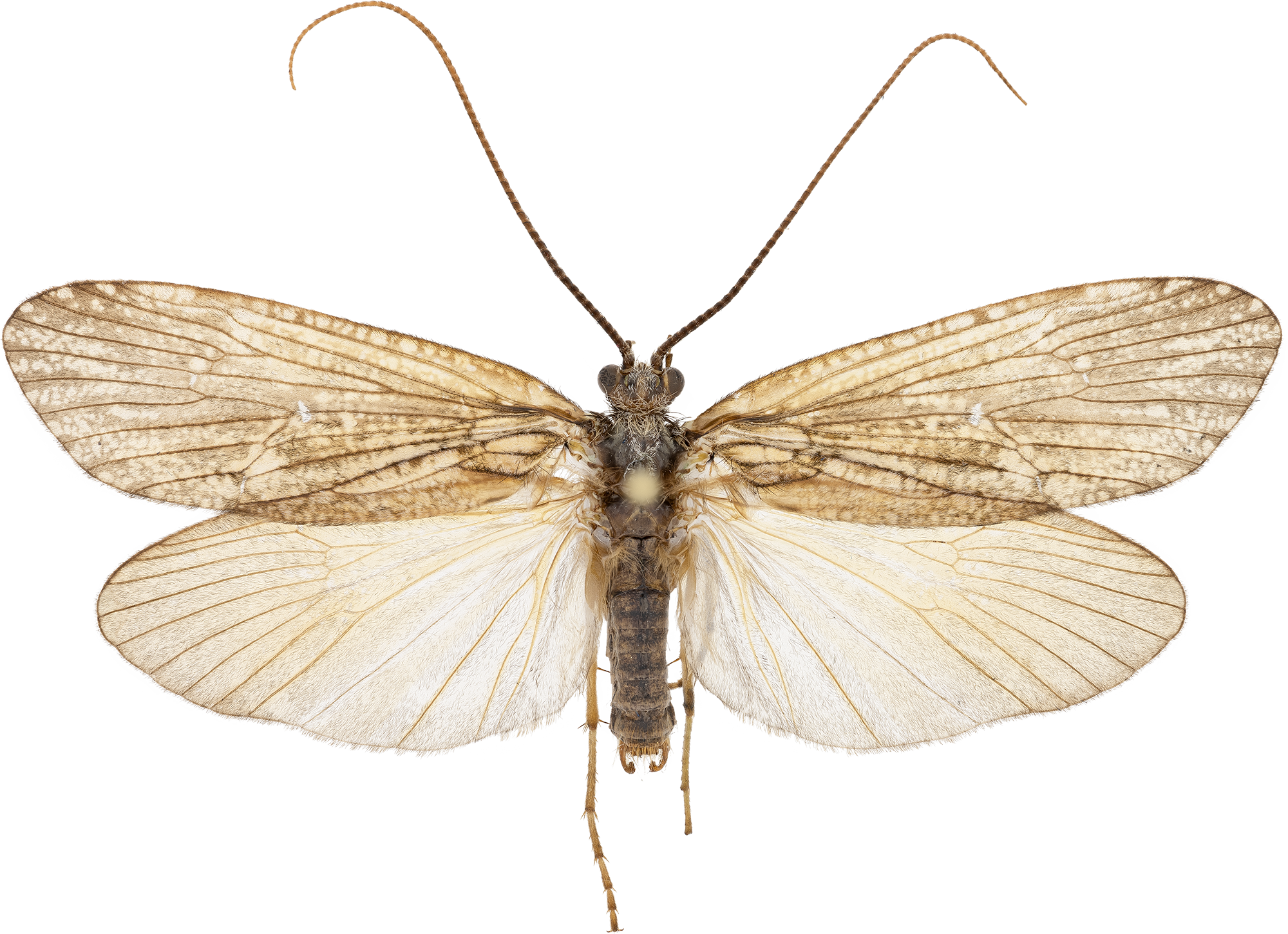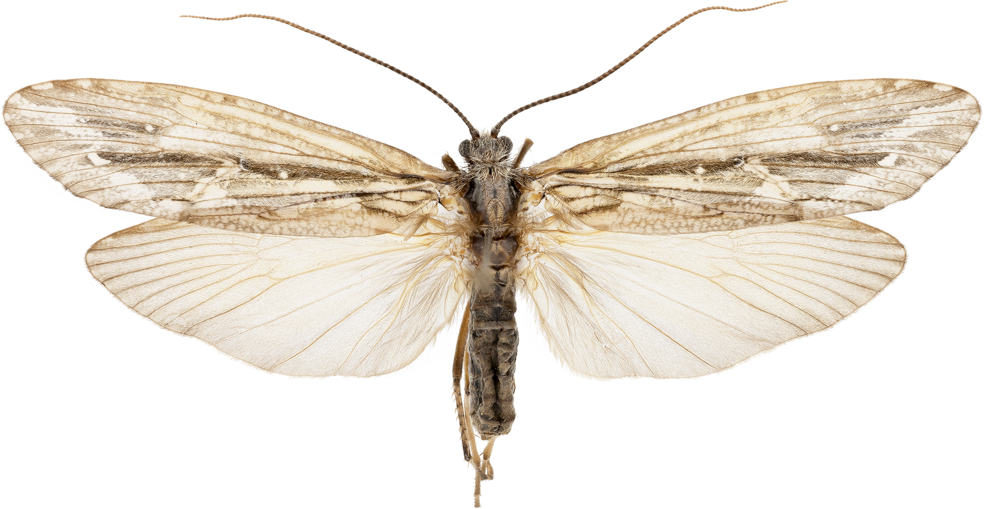 Phryganea grandis er en meget stor vårflue med brede, grålige framvinger. Arten er utbredt over hele landet. Larven lever i sjøer og rolige partier i elver. Den bygger et opptil 60 mm langt, portabelt hus av biter av plantemateriale arrangert i spiralform.