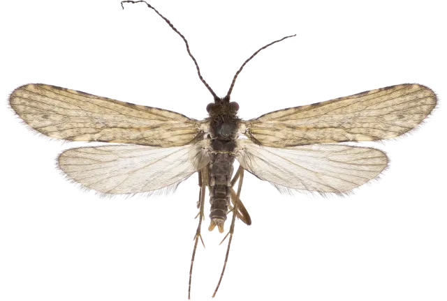 Cyrnus flavidus er en liten vårflue med smale, lyst grålige framvinger med gule flekker. Arten er funnet over det meste av landet. Larven lever i innsjøer, større dammer og sakteflytende elver. Den spinner et fastsittende traktformet fangstnett blant vannplanter.