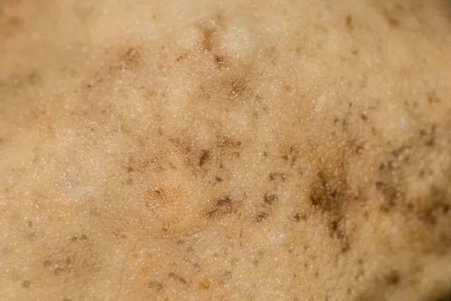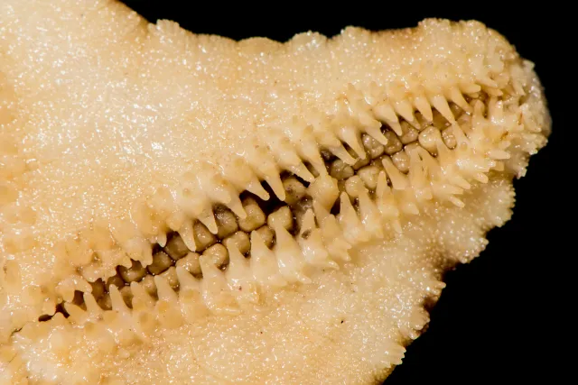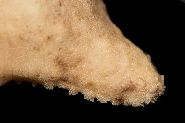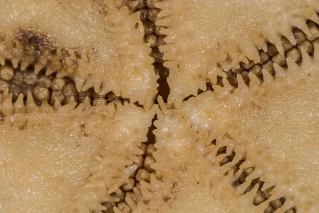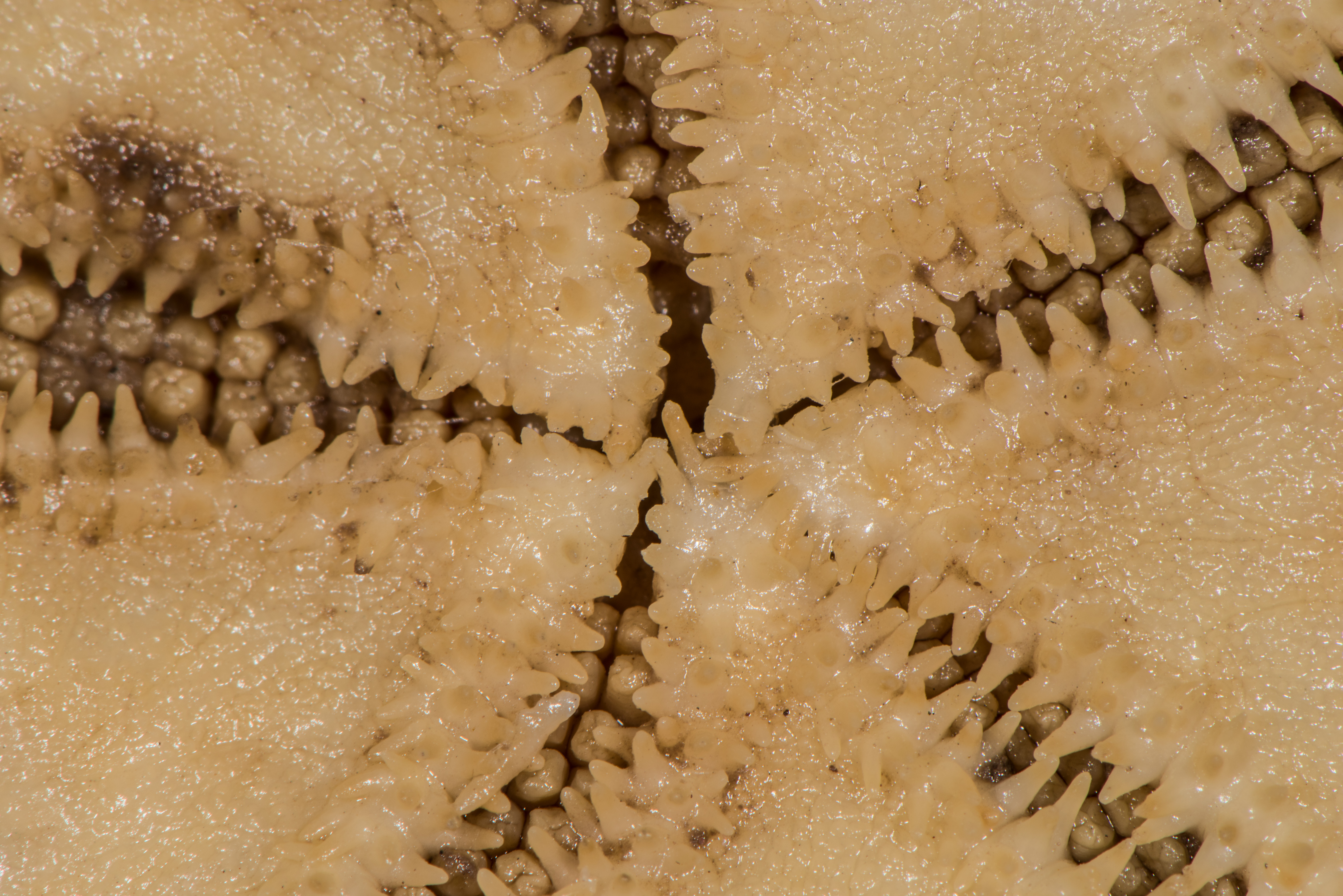 Fem armer og ganske rund på oversiden (konveks). Hele oversiden dekket med små korn, og grupper med blærer på opptil 10 stk. Marginalplatene er avrundet (uten pigger).