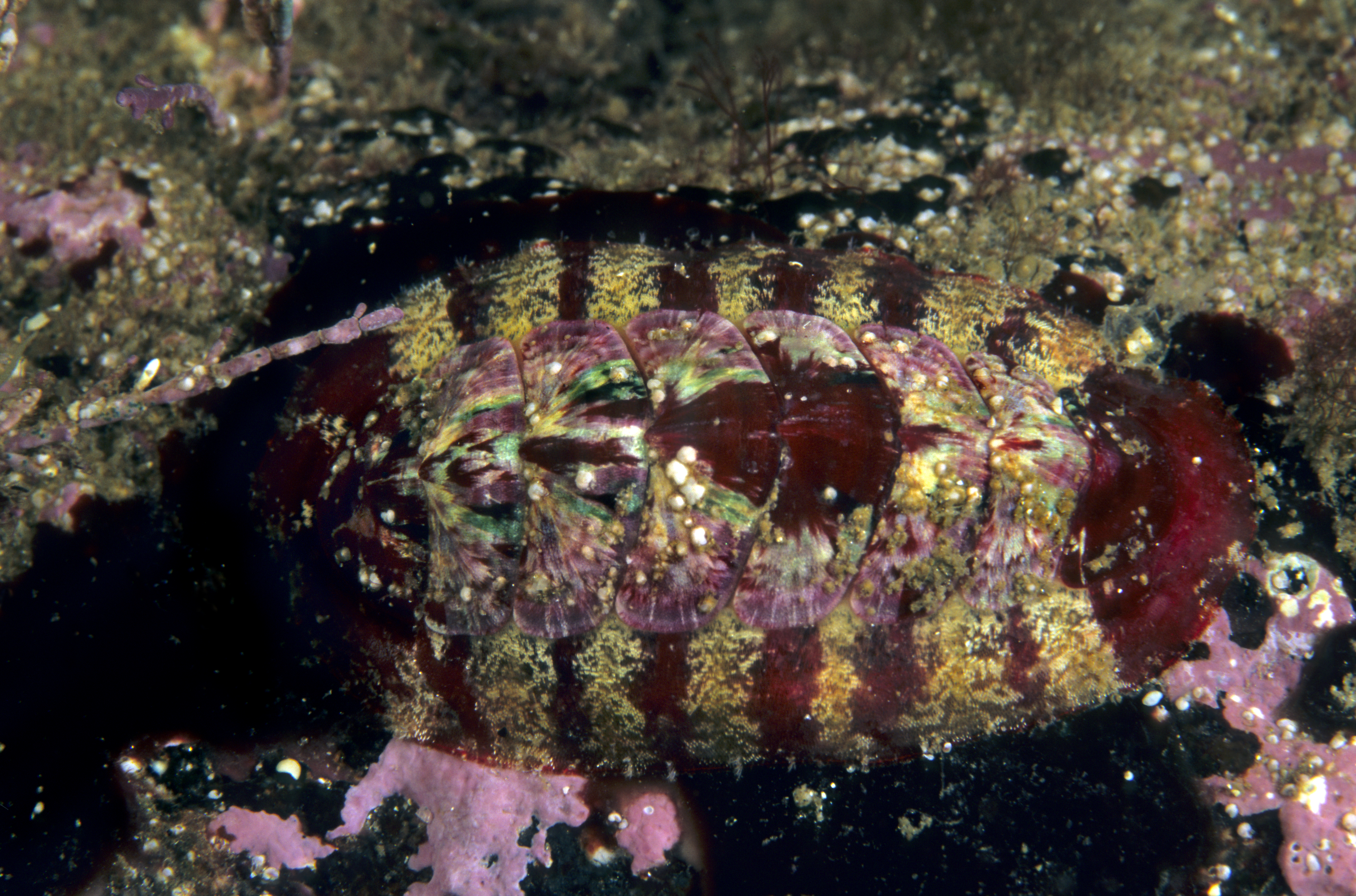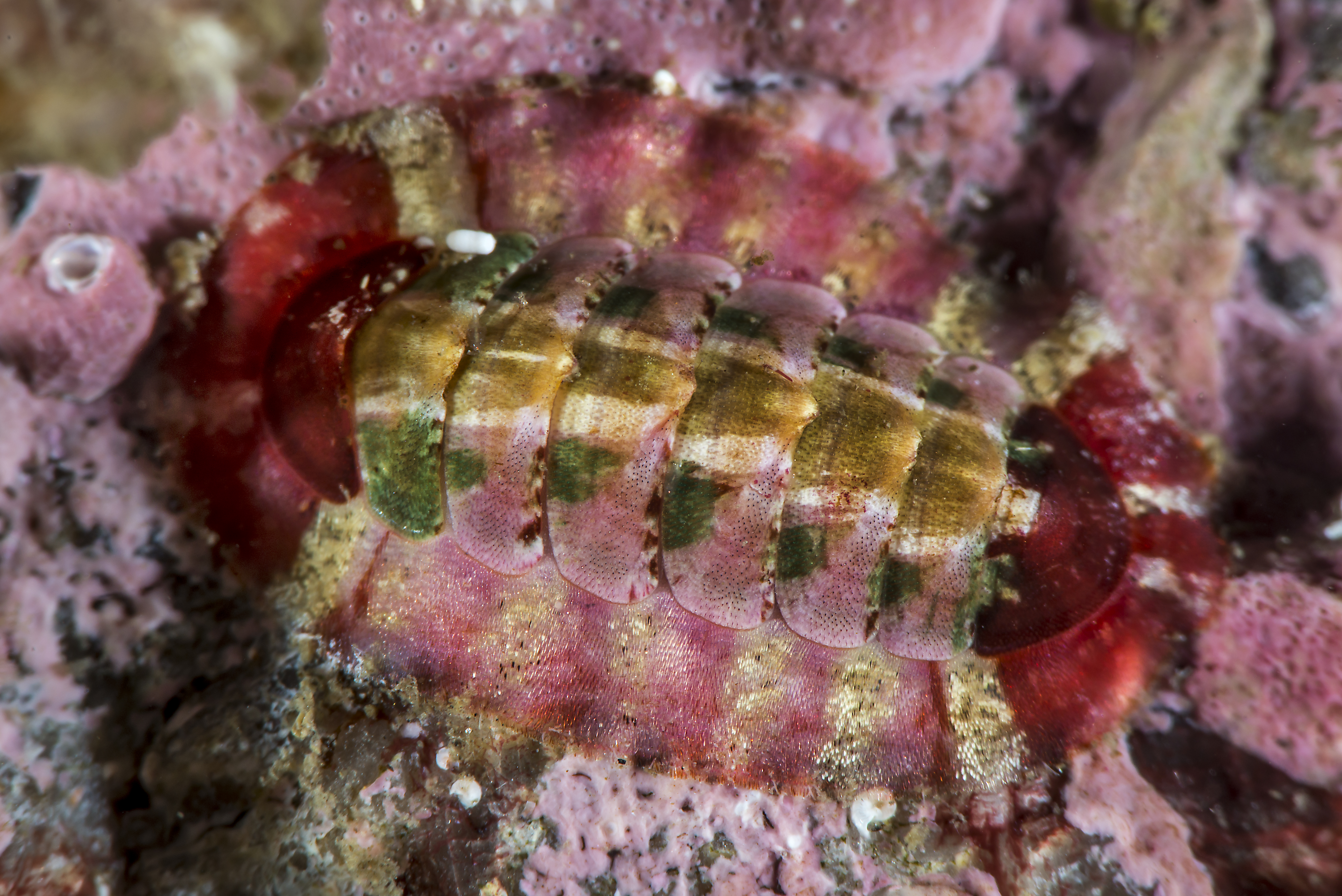 Flekkleddsnegl Callochiton septemvalvis er lett å kjenne igjen på de fire hvite båndene som finnes i hvert hjørne av kapperanden. I skallplatene finnes tallrike små øyne som kan være synlige som små sorte prikker.