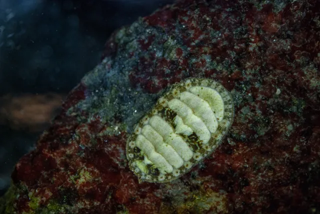 Innsamling av leddsnegler i felt. Her sitter Lepidochitona cinerea på et tomt skjell.