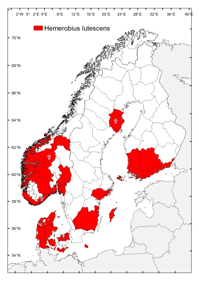 Hemerobius lutescens har en nokså vid utbredelse i Sør-Norge, men mangler i nord.