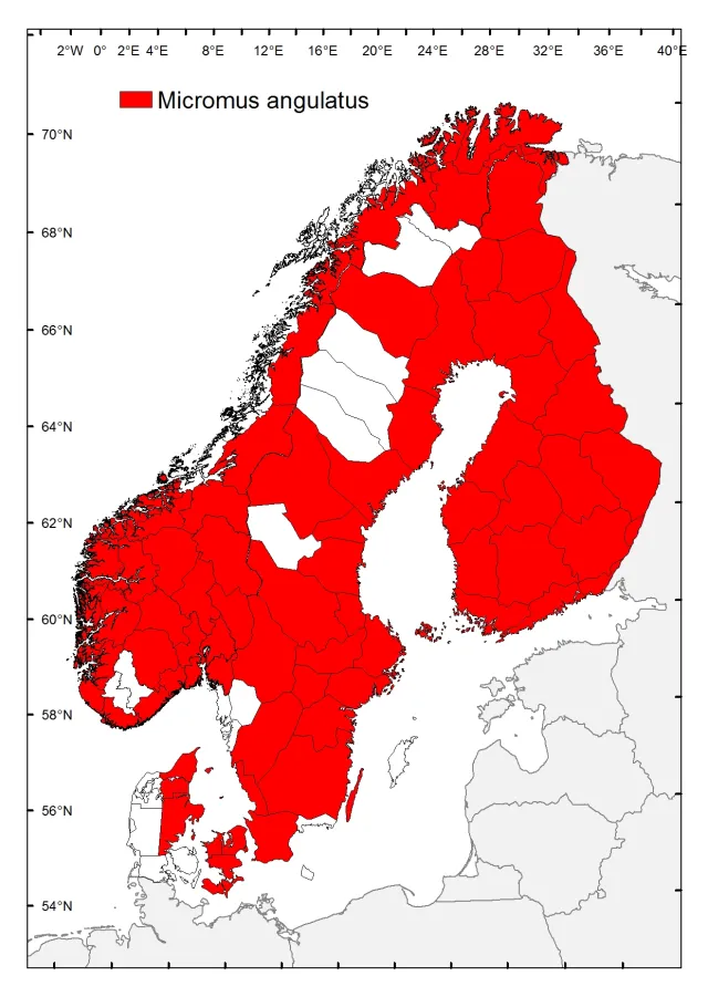 M. angulatus er vidt utbredt både i Norge, Sverige og Finland. I Danmark er den sjelden, og den mangler der i flere distrikter. Den finnes ellers i det meste av Mellom- og Nord-Europa. Det er i tillegg enkelte funn fra Middelhavslandene, og arten finnes også på Madeira og Azorene. Utbredelsen strekker seg videre østover gjennom Asia til Sibir og Japan. Den finnes dessuten i Nord-Amerika.