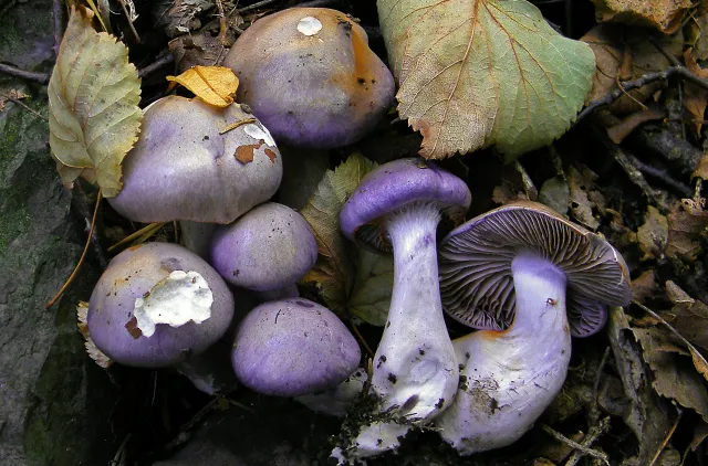 Skivene er også fiolette fra begynnelsen, etter hvert grålige, før sporene farger dem brune. Stilken (6–12 cm lang og 0,5–1,5 cm bred) har vanligvis klubbeformet basis, er opp til 2,5 cm bred, og blekt fiolett som ung. Den er lysere enn hatten, og blir etter hvert blek til nærmest olivengul (dels tiltrykt beltet av slimkappen som utgjør velumrestene, som sprekker opp). Kjøttet er blekt med fiolettskjær, særlig i stilktopp, og lukten er ubetydelig.