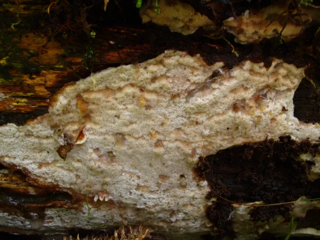 Fruktlegemene er ettårige og resupinate. Kjuken er voksaktig og noe gjennomskinnelig og osteaktig som fersk. Den er meget hard som tørr. Poreflaten er hvit som fersk, og ved tørking blir den okerfarget til blekt oransje. Porene er kantete og 4–6(–7) per mm.