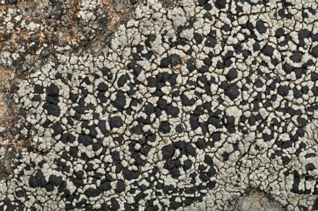 Thallus er areolert, og blir opptil 5 cm i diameter. Hypothallus er vanligvis godt utviklet, og er svart. Areolene er opptil 0,5 (–0,8) mm i diameter, lyst grå til middels grå og matte. Areolene er sammenstilte, mer eller mindre runde og middels til sterkt konvekse eller delvis halvkuleformete. Margen reagerer ikke med KI (marg KI–).