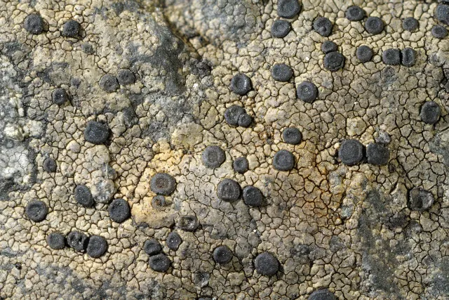 Thallus er oppsprukket og blir opptil 10 cm i diameter. Hypothallus er utydelig. Areolene blir opptil 0,5 (–1) mm i diameter, er mellomgrå til lyst oker og matte. Areolene er kantete og flate. Margen reagerer ikke med KI (KI–).