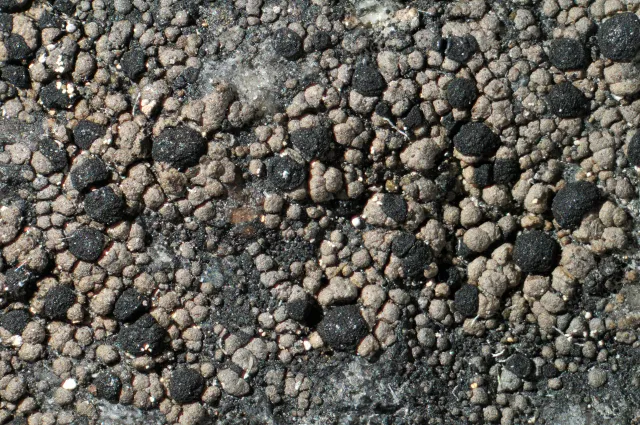 Thallus er areolert og blir opptil 5 cm i diameter. Hypothallus er godt utviklet og er svart. Areolene er opptil 0,5 mm i diameter, mellomgrå til mellombrune og matte. Areolene er spredtstilte til sammenstilte, runde til delvis kantete og moderat til sterkt konvekse. Margen reagerer ikke når KI tilføres (KI–).