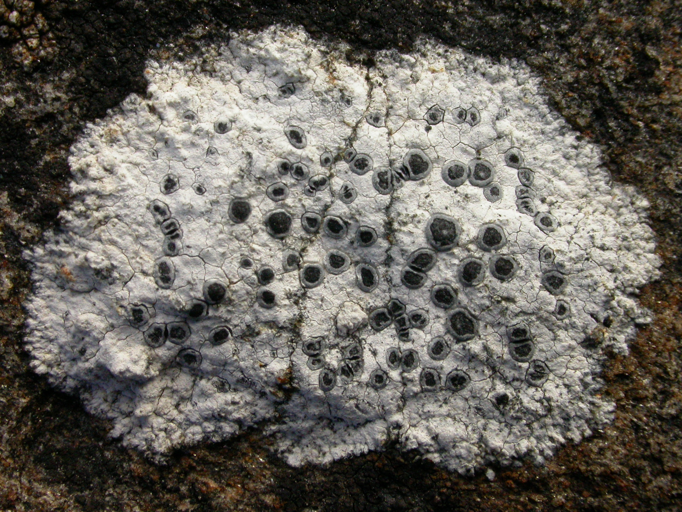 Thallus er sammenhengende til delvis oppsprukket og opp til 5 cm i diameter. Det er rent hvitt, matt og pruinøst (dogget). Hypothallus er vanligvis dårlig utviklet, det er svart og hvit-pruinøst. Margen reagerer ikke med KI (KI–).