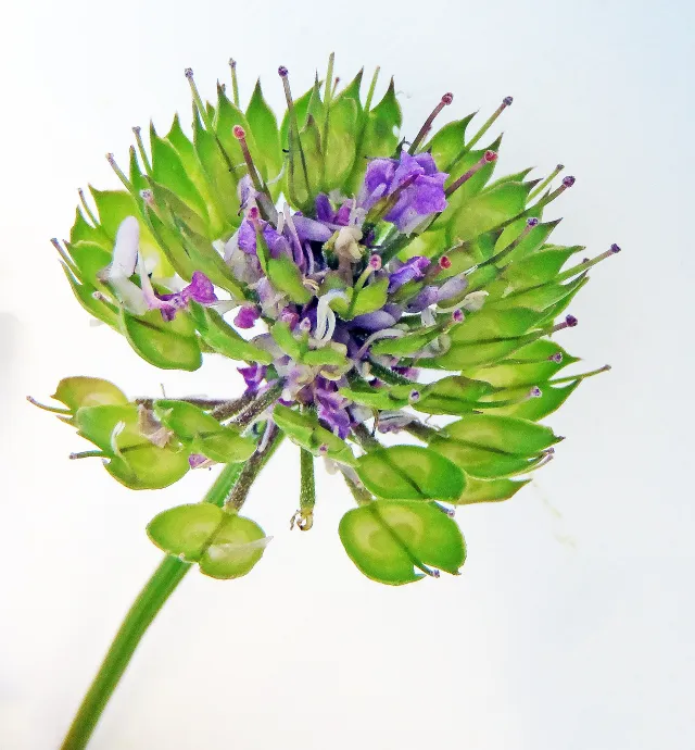 Frukta er ei avrunda kortskulpe, men med breie vengjekantar som går opp i to spissar ved sidan av griffelen. Griffelen stikk utom vengjekantane. Blomeskafta er ruhåra heilt rundt.