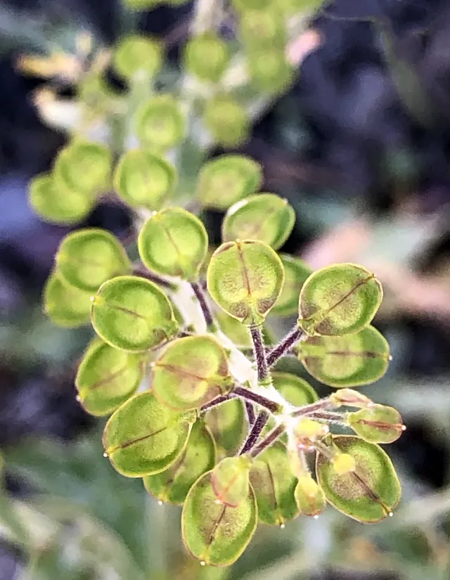 Fruktene er kortskulper som er meir eller mindre avrunda i omriss. Dei er ofte vengjekanta, men hos stankkarse, som vist her, er skulpa smal og førebels ikkje særleg utvikla.