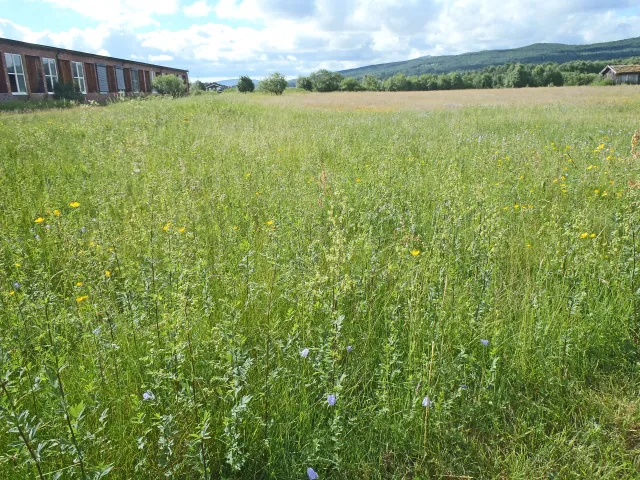 Rankfrøstjerne dominerer her ei overlaten slåtteeng på Røros.