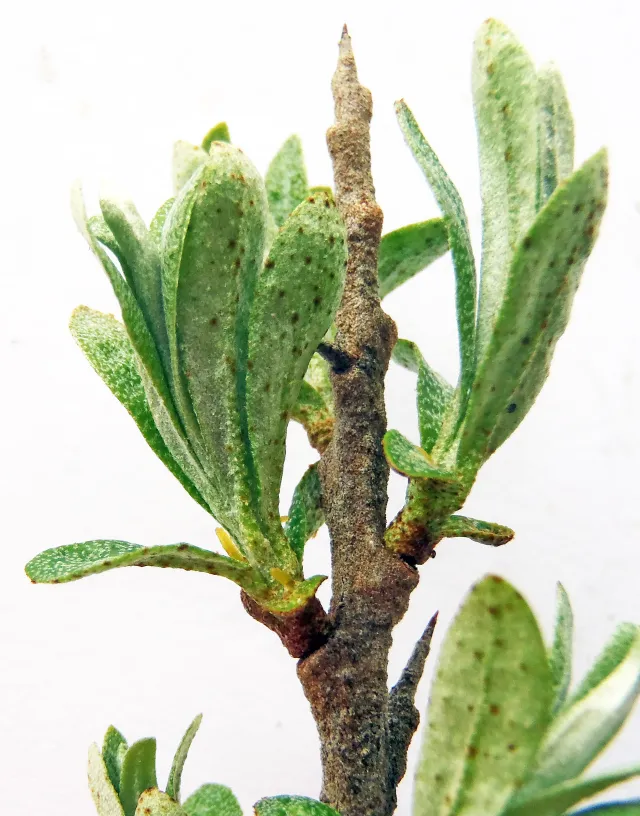 Tindved har omlag uskaftete, smale blad der de grønne overflatene får et grålig skinn av et ujevnt dekke av skjoldhår. Undersiden er sølvgrå. Bladene sitter ofte tett sammen i små "bunter". Skjoldhår finnes også på kvister og frukt. Fra Malvik (Sør-Trøndelag).