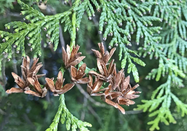 Mogne kongler hos tuja opnar seg med sprikjande kongleskjel.