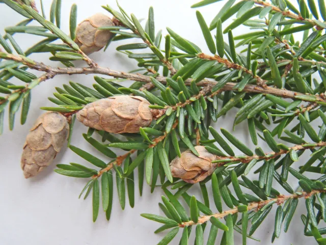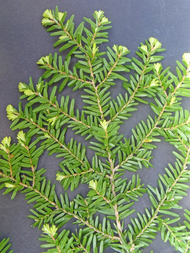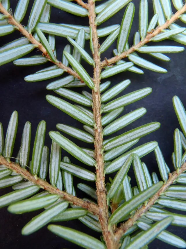 Undersida av nålene hos vestamerikansk hemlokk har breie, kvite band med spalteopningar.