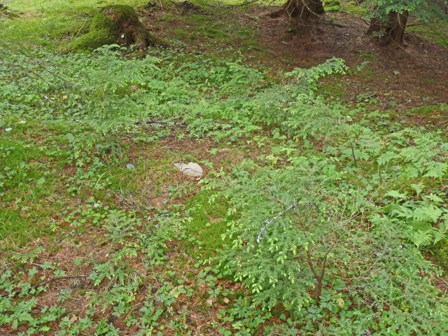 Vestamerikansk hemlokk i restane etter Lippes Arboret i Bymarka i Trondheim.
