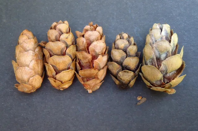 Konglene hos vestamerikansk hemlokk er små, sitjande og hengande.