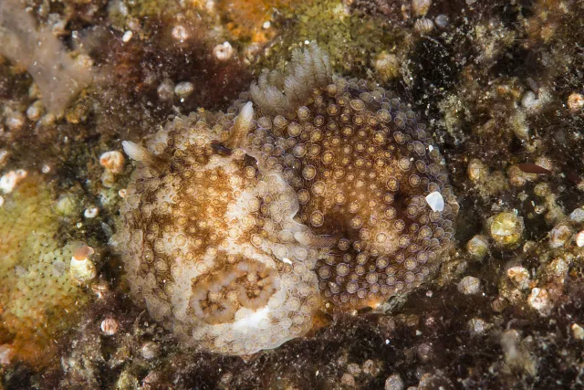 Onchidoris bilamellata er en av de vanligste nakensneglene i fjæresonen langs norskekysten, der den beiter på rur.