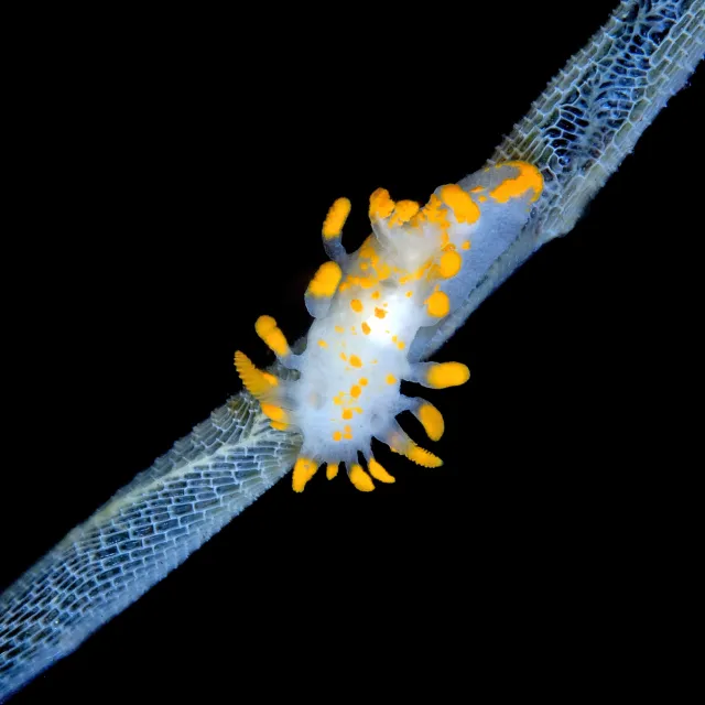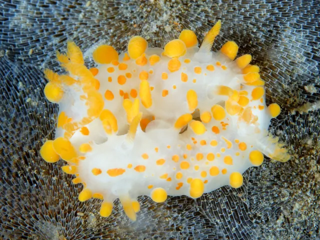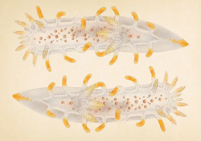 Kroppsfargen er gjennomsiktig hvit. Både rinoforene, kappetuberklene og gjellebusken har tydelig gul pigmentering på toppen, noe som gjør at denne opptil 40 mm store arten er enkel å få øye på.
