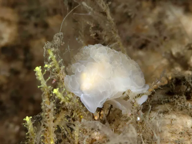 Slik ser Lomanotus genei ut in situ. Bemerk de hvite eggsekkene fra parasitten Lomanoticola insolens på ryggen av sneglen.