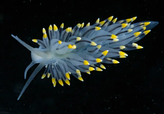 Kroppsfargen er gjennomsiktig gråhvit. Tuppene på cerata er pigmentert med en kraftig gul eller gylden ring under et bredt hvitt bånd. Tarmkanalene i cerata har som regel en blåsvart farge, men kan også være nesten lys brune.