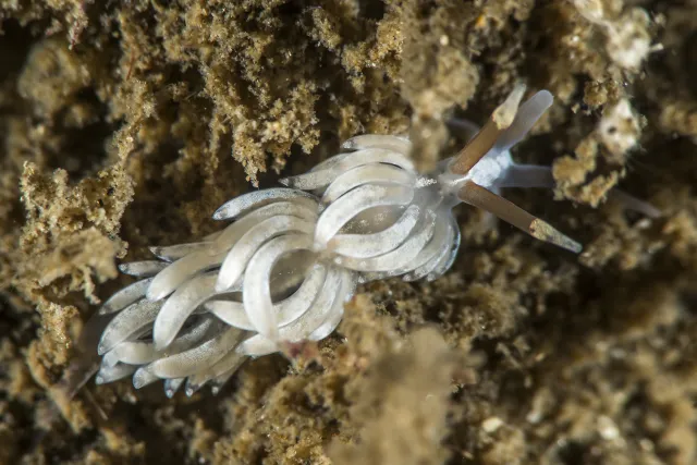 Favorinus branchialis er en nakensnegl som lever i tareskogen og spiser egg fra andre nakensnegler. Den er vanlig langs hele norskekysten.