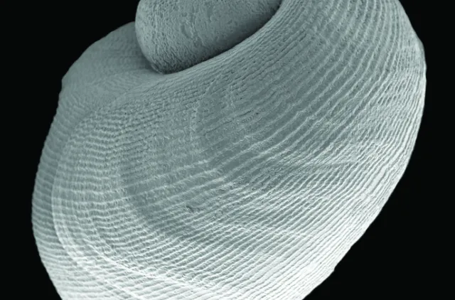 Skallets dorsalside, med den første vridningen av skallet (SEM), målestokk = 100 μm.