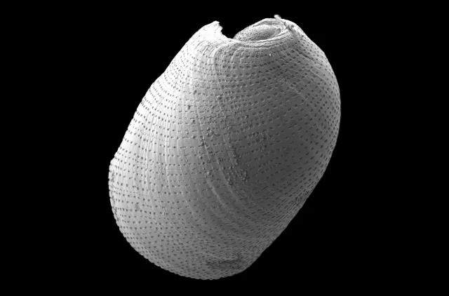 Skulpturen på skallets overflate (SEM), målestokk = 20 µm.