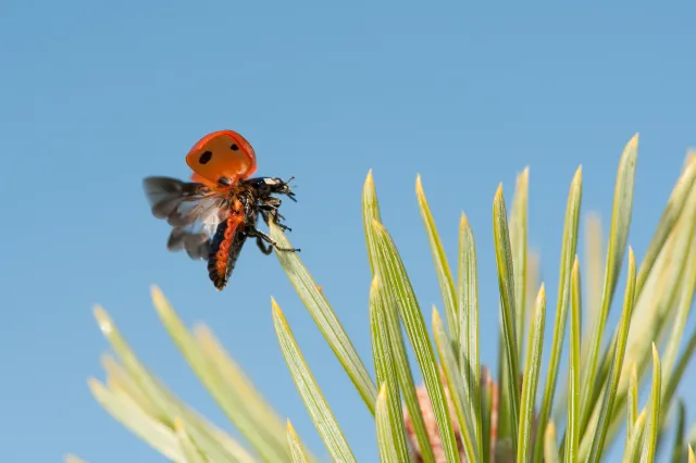 Sjuprikket marihøne Coccinella septempunctata i flukt.