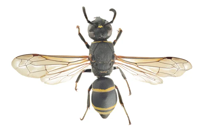 Hos hunnen er hodet svart med en gul panneflekk og en liten gul flekk bak hvert fasettøye. Munnskjoldet er noe tilspisset med en smal og grunn innskjæring i framkanten. Antennene er helsvarte. Bakhodet er relativt kraftig. Mellomkroppen hos begge kjønn er svært kompakt og svart med gule tegninger langs frambrystets framkant og av og til på skutellum. Kroppen er tett og kort behåret. Vingeskjellene er tilspisset baktil. Bakryggen har ei opphøyd taggete tverrlist. Etterryggens øvre kant er uttrukket i en stor tagg på hver side. Bakkroppen hos begge kjønn har lyse bånd langs bakkanten på de 4 første leddene. Disse båndene er ofte forkortet mot sidene på fjerde ledd. Andre bukledd hos begge kjønn har en kraftig inntrykning på tvers ved basis og en langsgående inntrykning i midten fra tverrlisten til ca. midt på leddet.