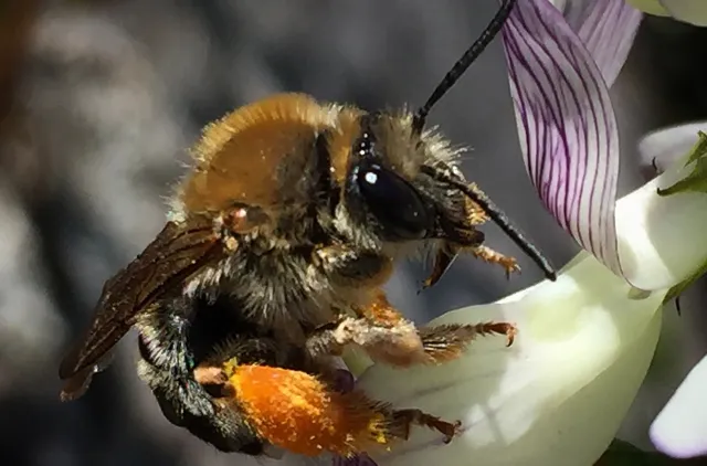 Sansebie Eucera longicornis, hunn som sanker pollen fra skogvikke.