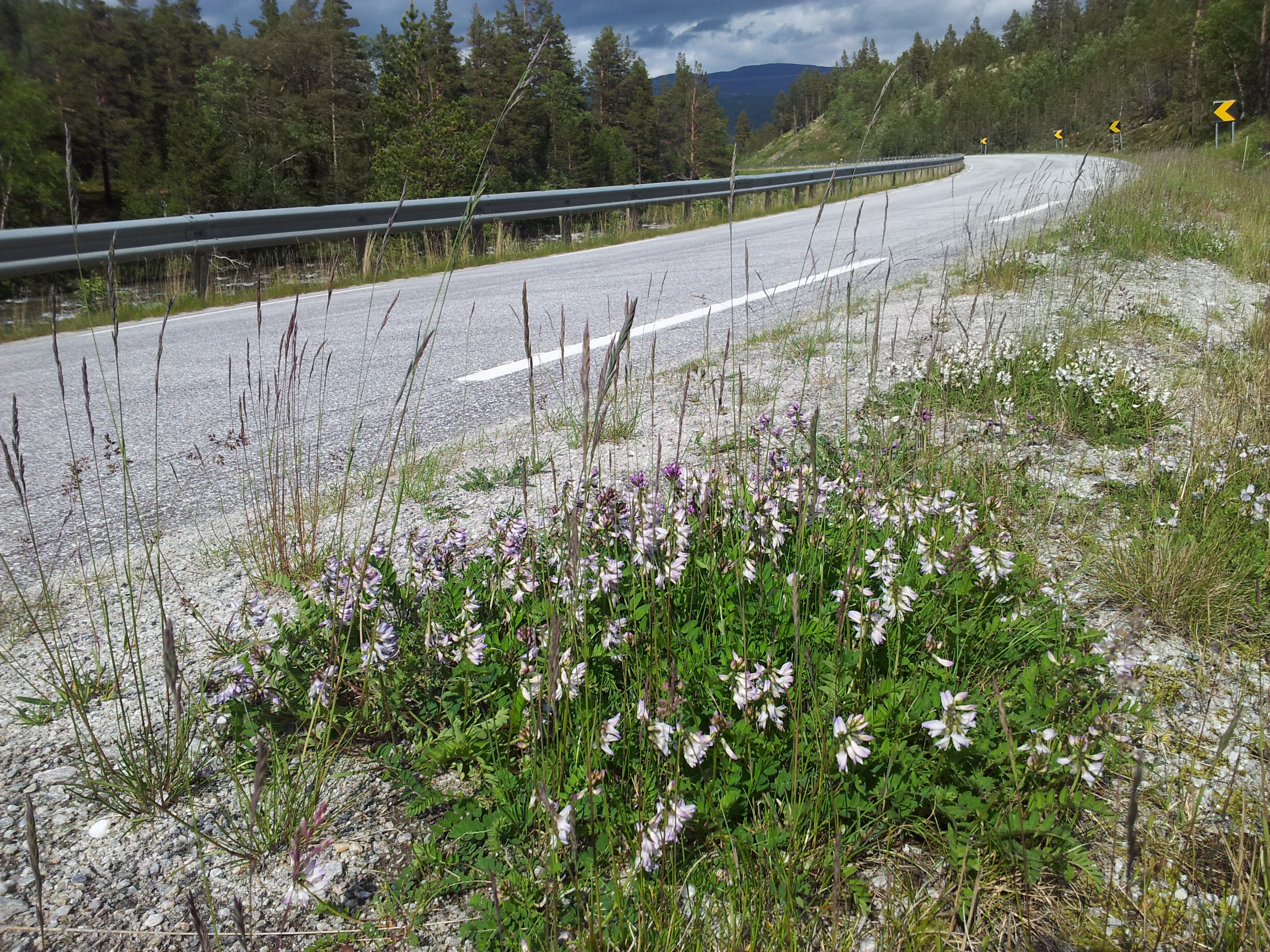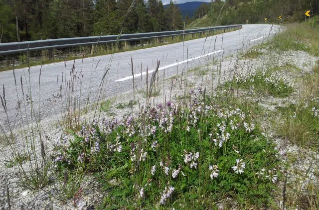 Veikanter har ofte et rikt mangfold av planter som utgjør et viktig tilskudd av pollen og nektar for humlene. Ulempen er imidlertid at humlene risikerer å bli påkjørt i trafikken. Bildet viser setermjelt langs fylkesvei 29 gjennom Folldal i Hedmark.