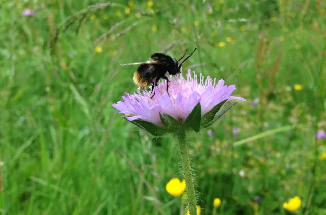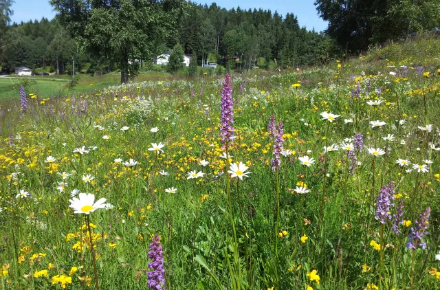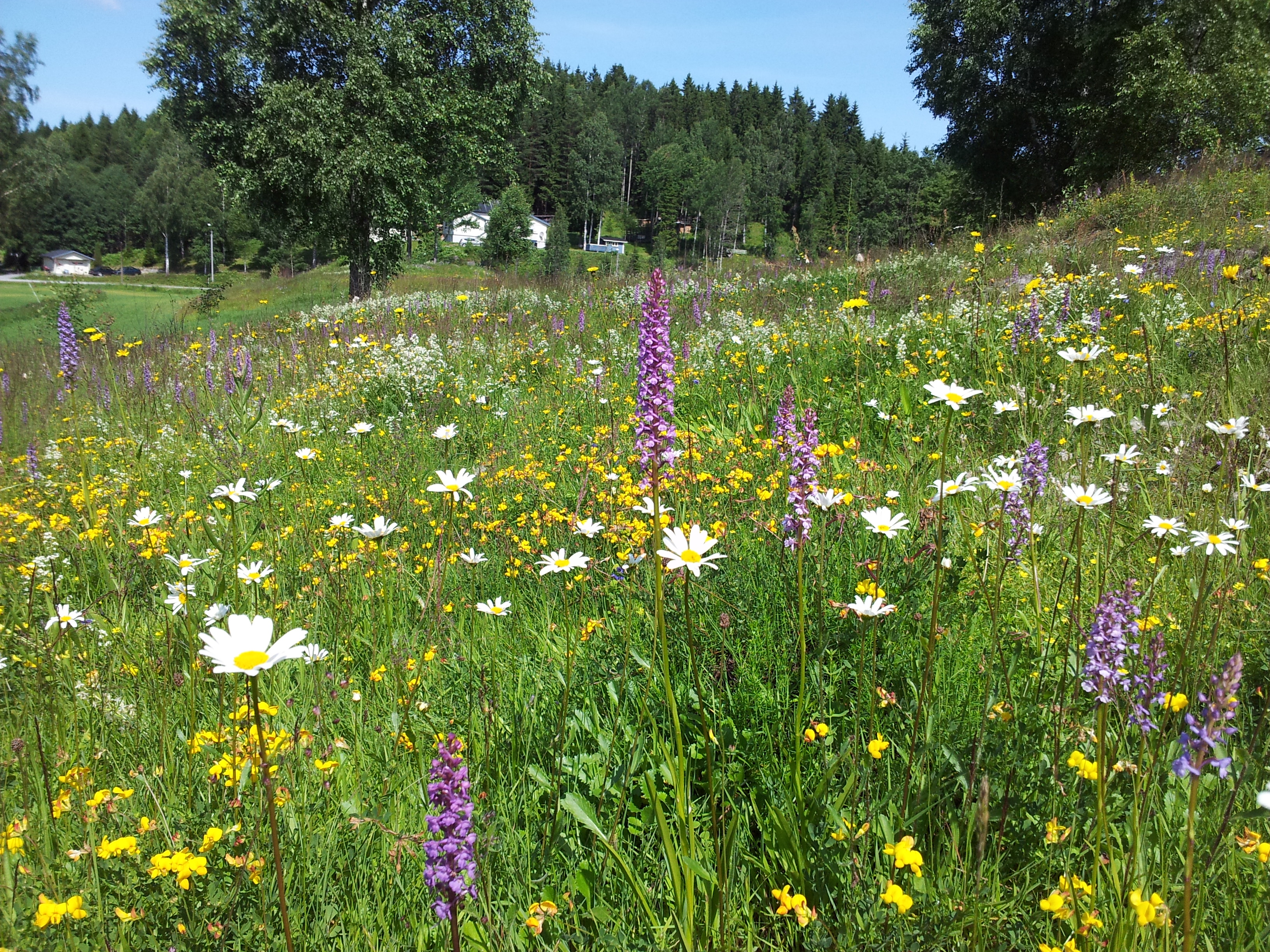 Blomsterrike slåtteenger er viktige naturtyper for humler og en rekke andre insekter. I dag er det langt mellom slike områder, og mye tyder på at mangel på blomster er en viktig årsak til at flere arter av pollinerende insekter har gått tilbake. Bildet er fra Aremark i Østfold.