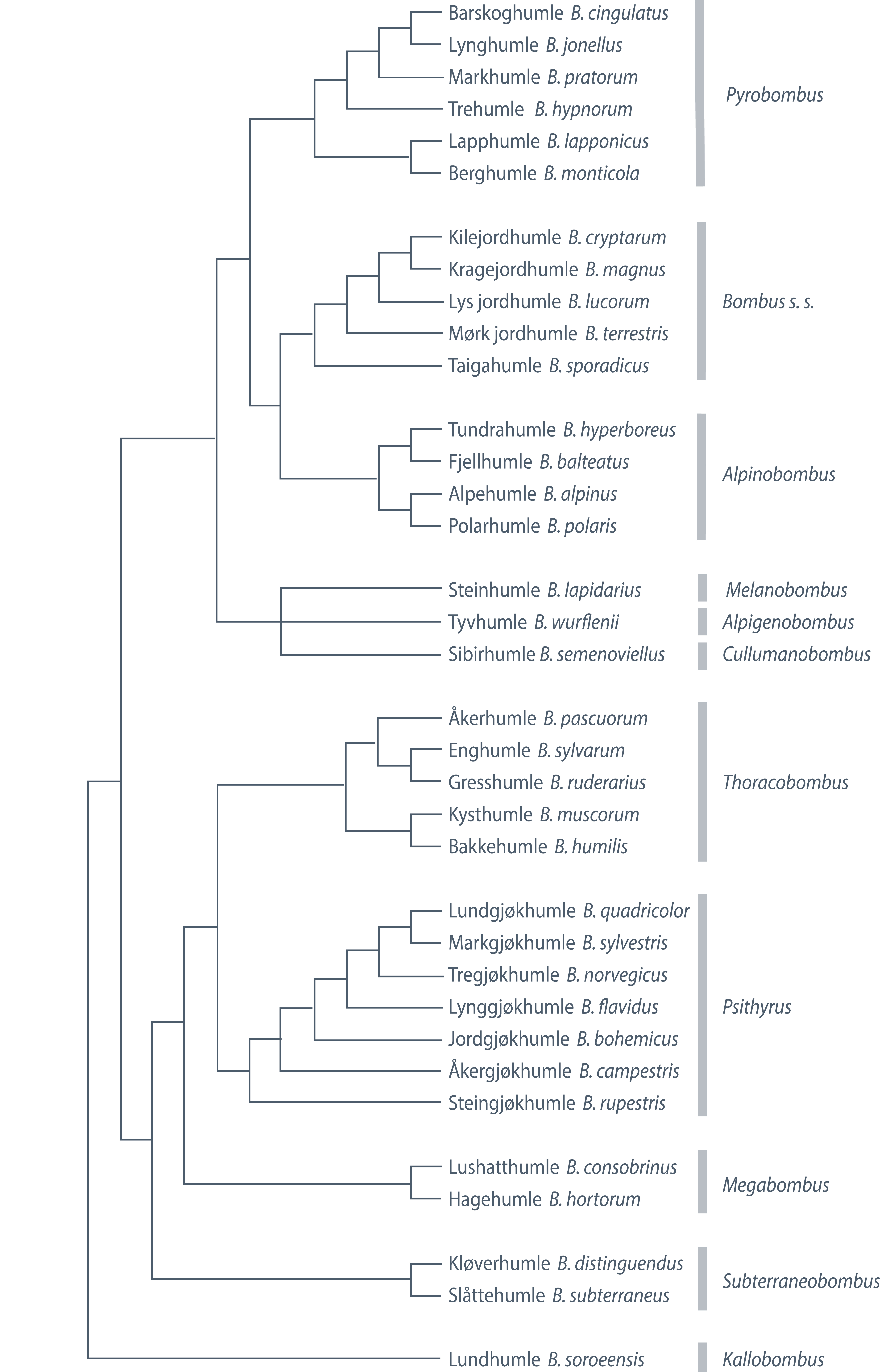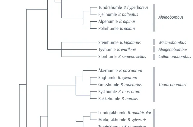 Slektskapet mellom de 35 humleartene som er påvist i Norge og deres tilhørighet til ulike underslekter. Omarbeidet etter Cameron et al. (2007).