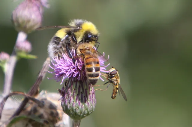 Lys jordhumle Bombus lucorum, honningbie Apis mellifera og blomsterflue i samme matfat.