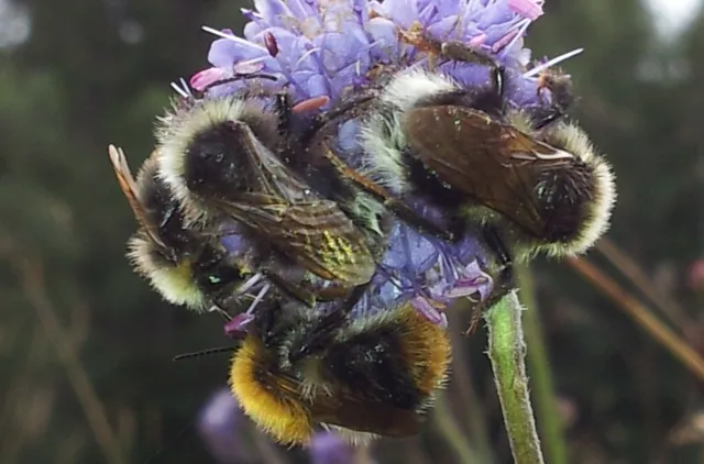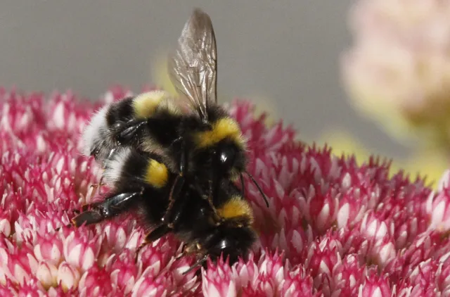 Paring hos jordhumler Bombus sp. på bergknapp (Sedum sp.), Titran i Frøya, Sør-Trøndelag, 1. oktober 2010. Dette er høyst trolig kilejordhumle Bombus cryptarum, men eksemplarene ble ikke samlet inn og kan derfor ikke artsbestemmes sikkert.