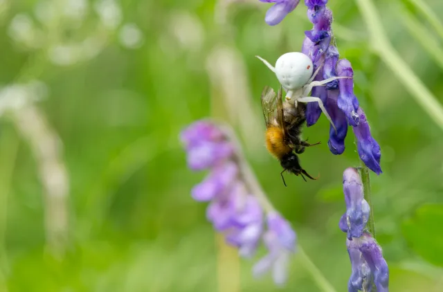 Til tross for varselfarger og stikkebrodd har humlene mange fiender. Her har en krabbeedderkopp tatt ei åkerhumle. Flere arter av pattedyr og fugler tar også humler, men av størst betydning for regulering av humlesamfunnene er trolig parasitter og sykdomsorganismer, samt klima og værforhold.