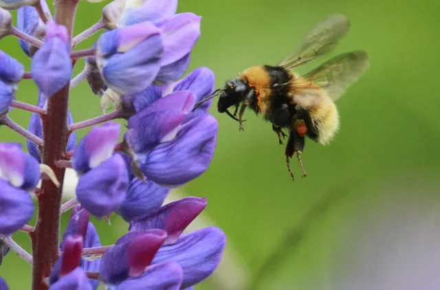 Dronning av kløverhumle Bombus distinguendus. Lupiner kan være en god pollenkilde for humler, men planten er svartelistet og uønsket fordi den fortrenger stedegne plantearter og endrer naturtypene der den vokser. Dette kan også være negativt for humlesamfunnene.