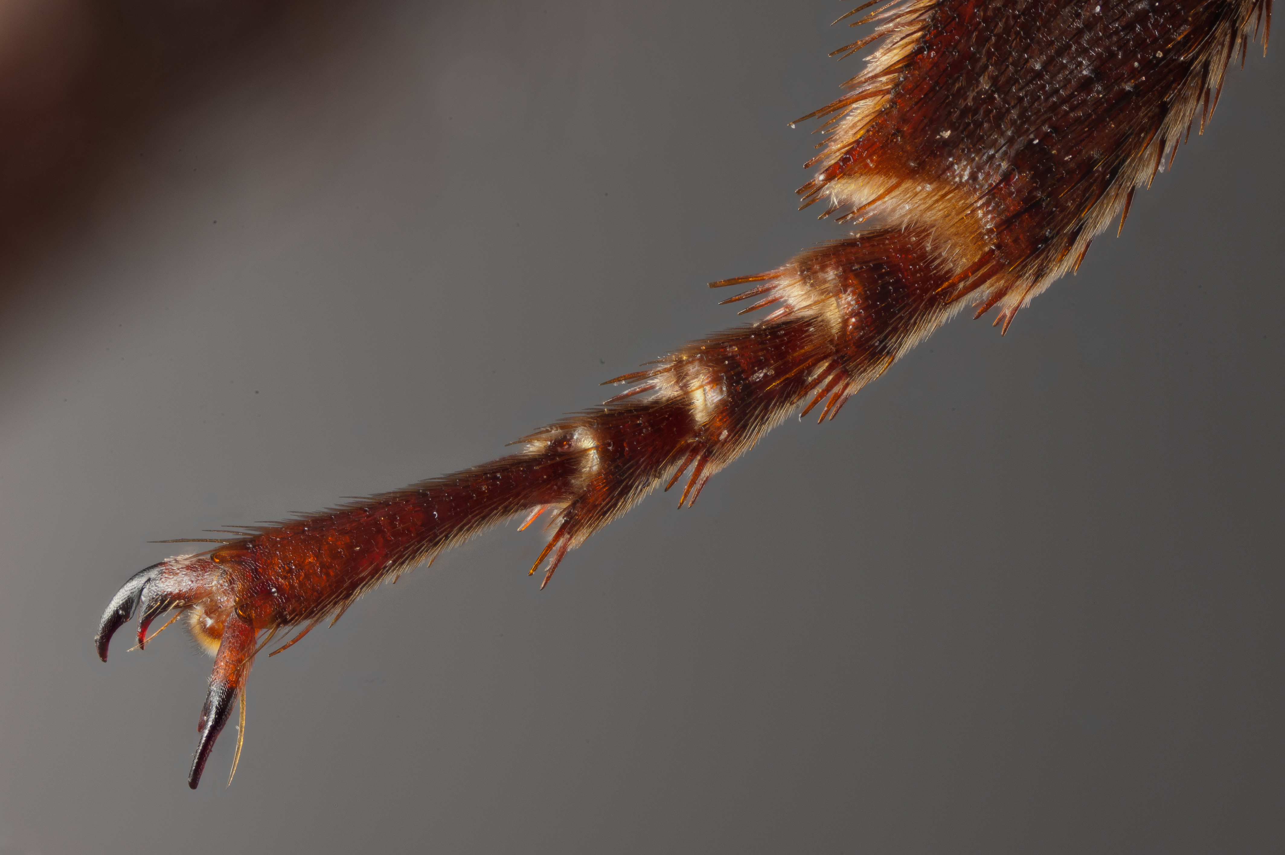 Midtre basitarsus hos hagehumle Bombus hortorum. Legg merke til den spisse piggen i enden av leddet.