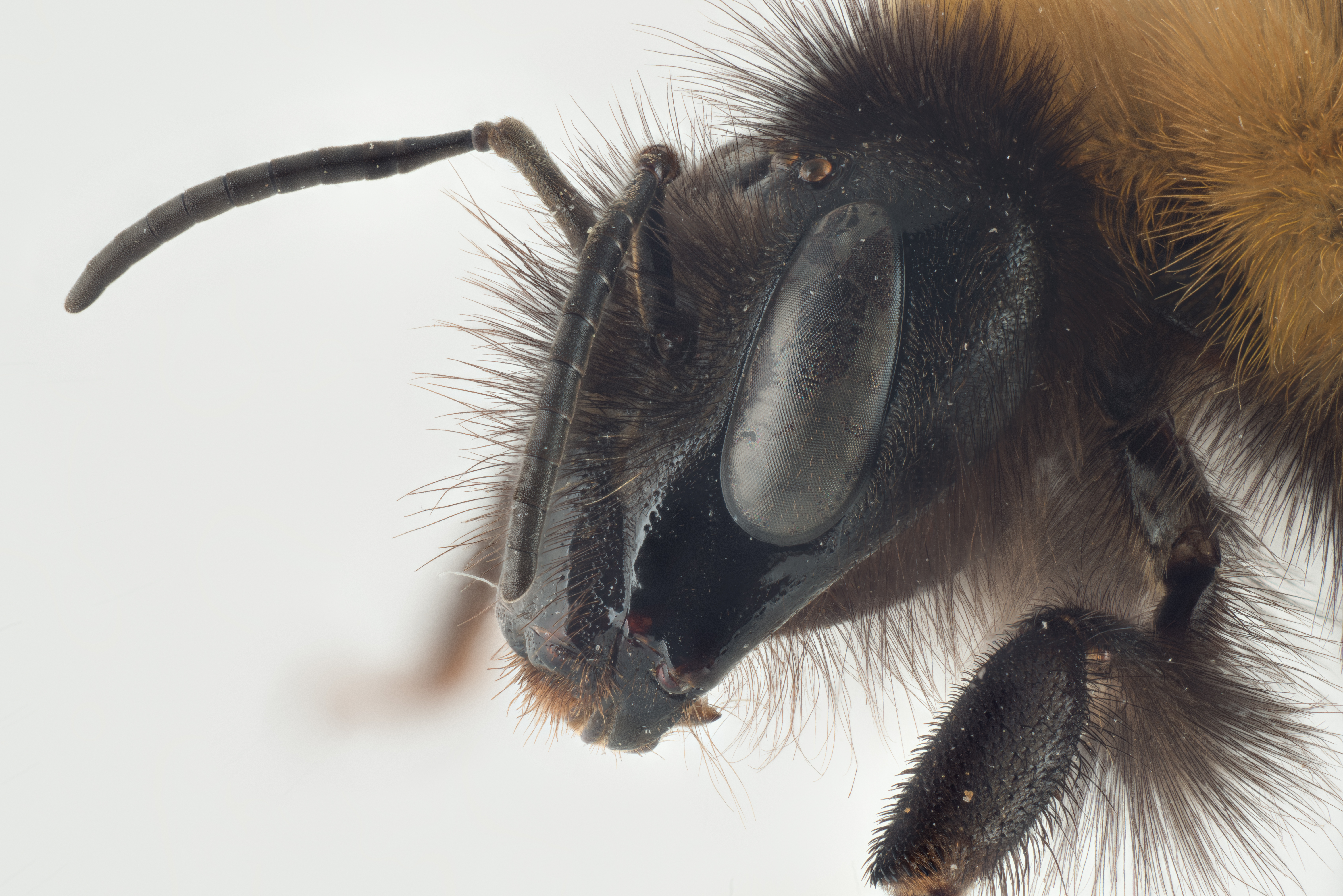 Hode av hagehumle Bombus hortorum, dronning, fra siden. Merk at kinnlengden delt på kinnbredden ved mandibelbasis er ca. 1,7.