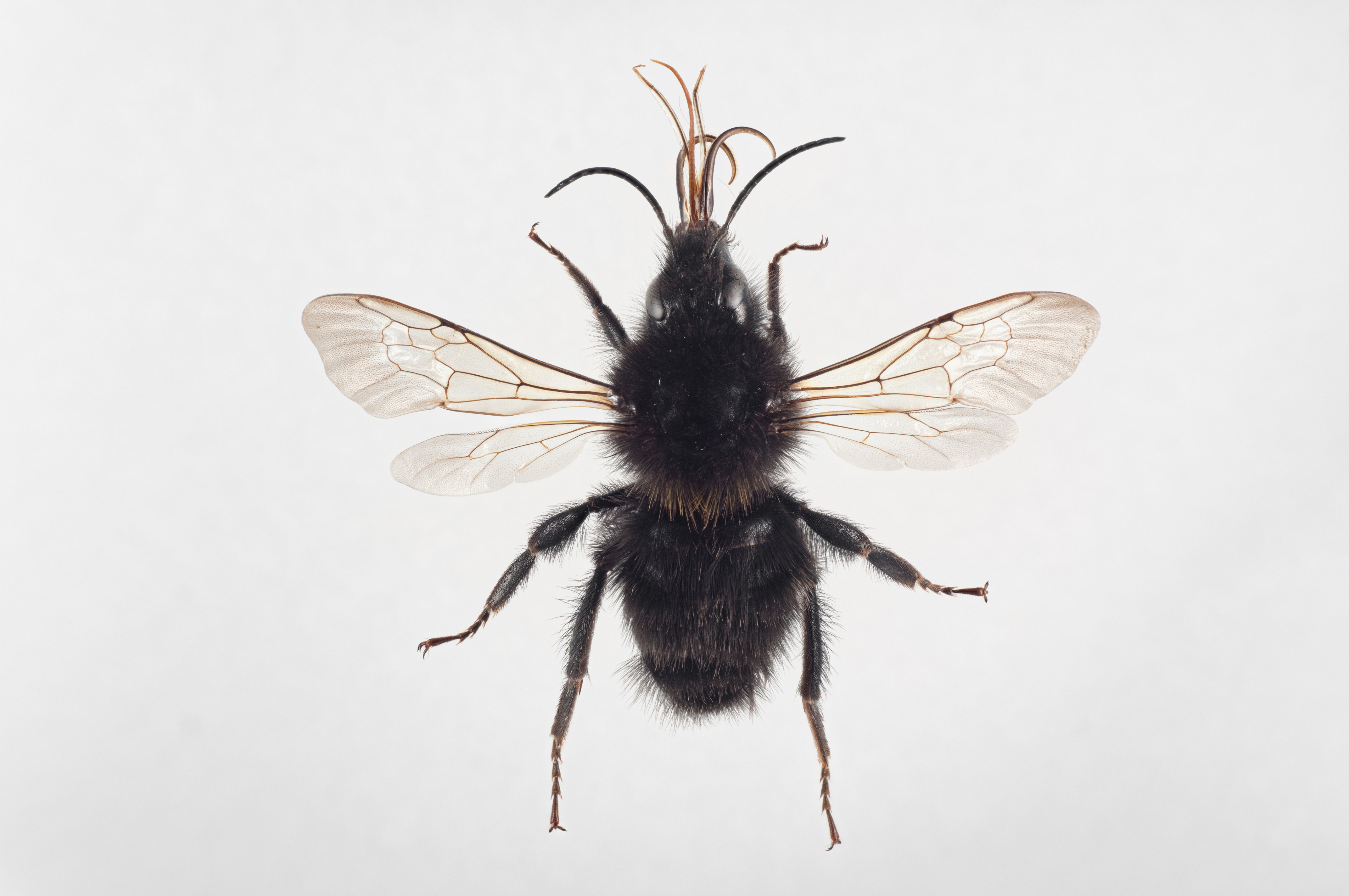 Hann av hagehumle Bombus hortorum, melanistisk form. Merk at de melanistiske hannene av hagehumle ofte er helsvarte også på bakstussen.