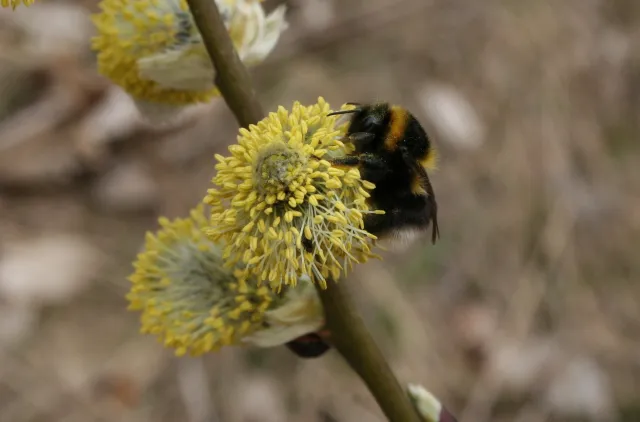 Dronning av lynghumle Bombus jonellus på blomstrende selje, Salix caprea, Skatval i Stjørdal, Nord-Trøndelag.