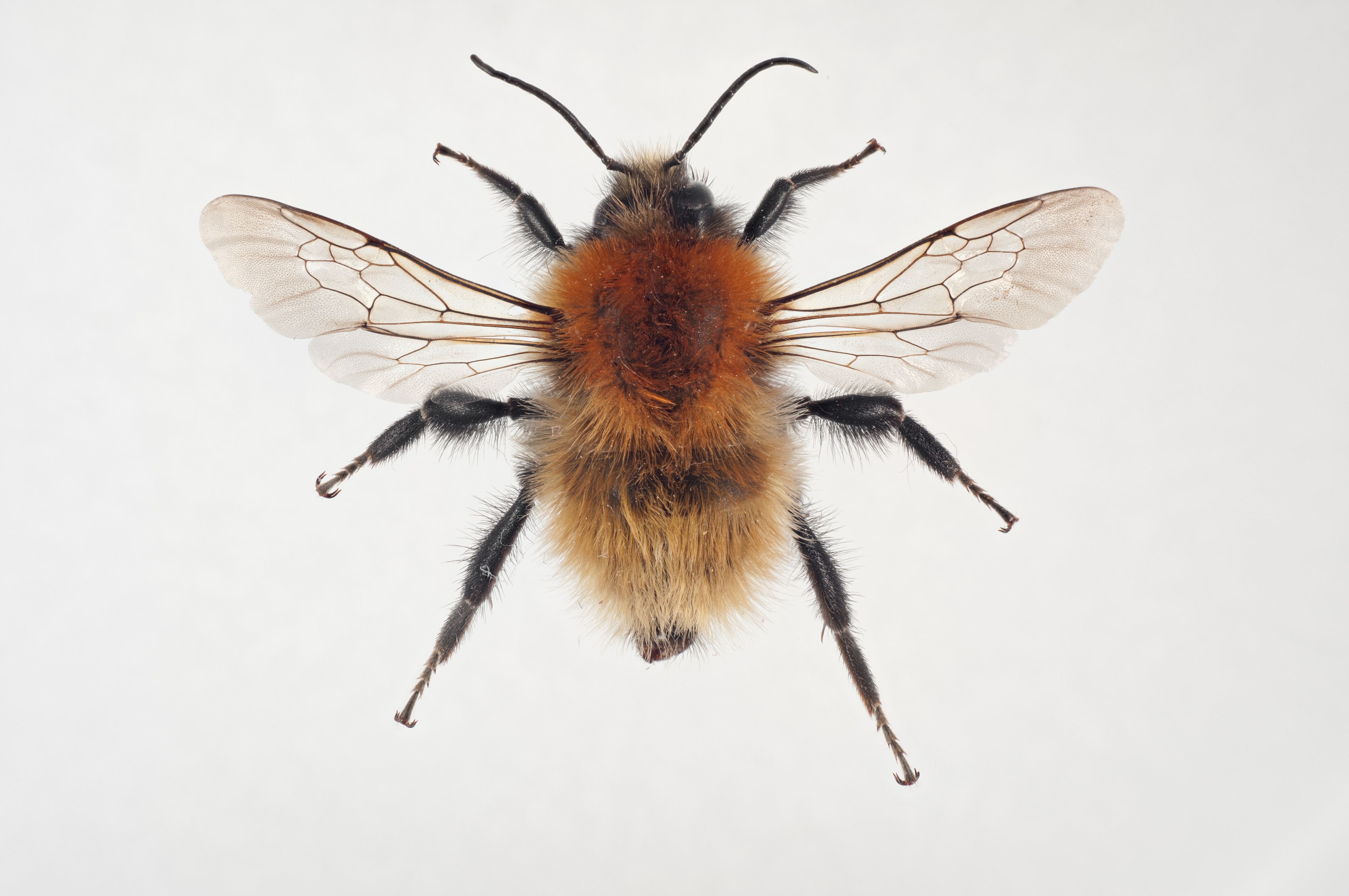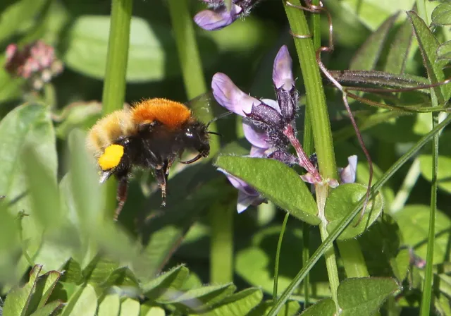 Dronning av kysthumle Bombus muscorum på vei til en gjerdevikkeblomst fra Sleneset i Lurøy, Nordland. Legg merke til de velfylte pollenkorgene.