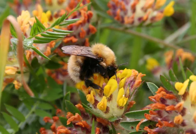 Kysthumle Bombus muscorum finnes, som navnet sier, langs kysten, og trives på erteblomster. Her en nokså blek kysthumledronning fra Stokkøya i Sør-Trøndelag som samler nektar fra rundbelg.