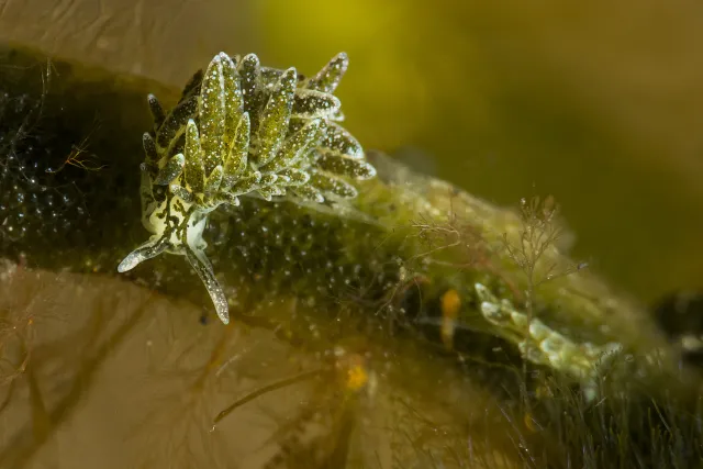Placida dendritica er en herbivor cellesuger som spiser på grønnalger som pollpryd. Den er lett å kjenne igjen på de grønne tarmkanalene som lyser opp både kroppen og cerata.